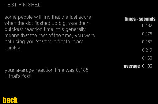 http://www.mathsisfun.com/games/reaction-time.html 反射神経テスト!! 赤丸が黄色に変わったらクリックするだけ。 5回やって最後に平均が出ます。 たぶん5回目の数値はみんな速くなるんじゃないかなw 2回目で0.196。 何回か頑張ったら最速で0.185までいきました。 訓練したらもっと速くなるのかな? だいたい0.2秒~0.25秒が人間の平均らしい。 that's fast!ってことはちょっとは速い方なのかね。 FPSのプロゲーマーなんかはアベレージで0.16とか出しちゃうらしいwwwww 2010年!明けましておめでとうございます!!
